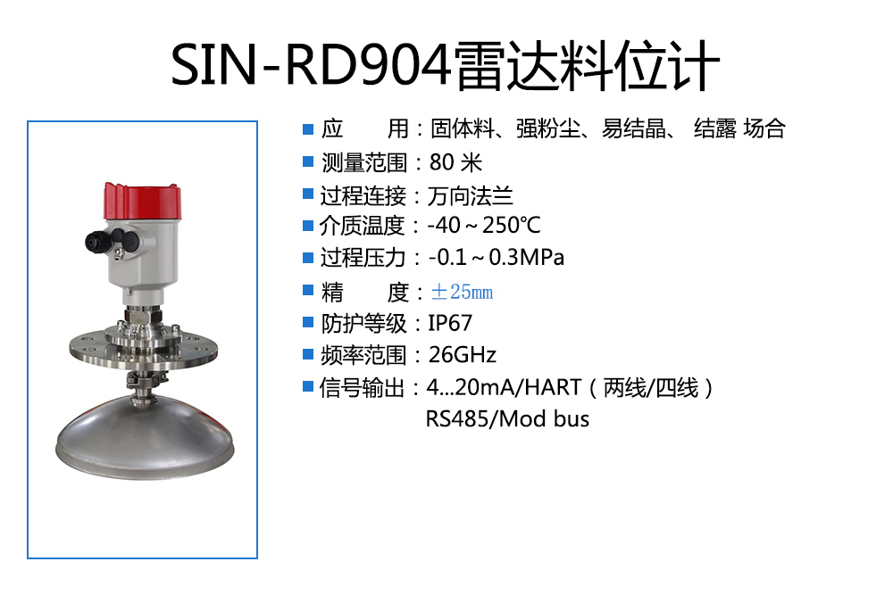 當(dāng)前位置:首頁(yè) > 雷達(dá)液位計(jì) > 聯(lián)測(cè)_SIN-RD904雷達(dá)料位計(jì)_適用于強(qiáng)粉塵、易結(jié)晶 _